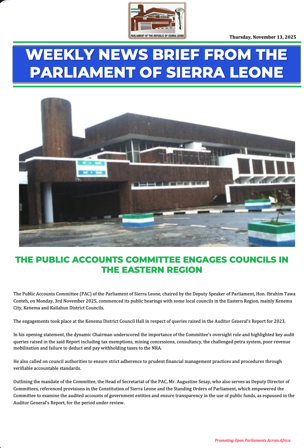 📢 Legislative Alert!Stay updated with the latest developments from the Parliaments of Sierra Leone, Ghana, Nigeria, Côte d’Ivoire, and Senegal.Be informed. Be engaged. Be empowered!