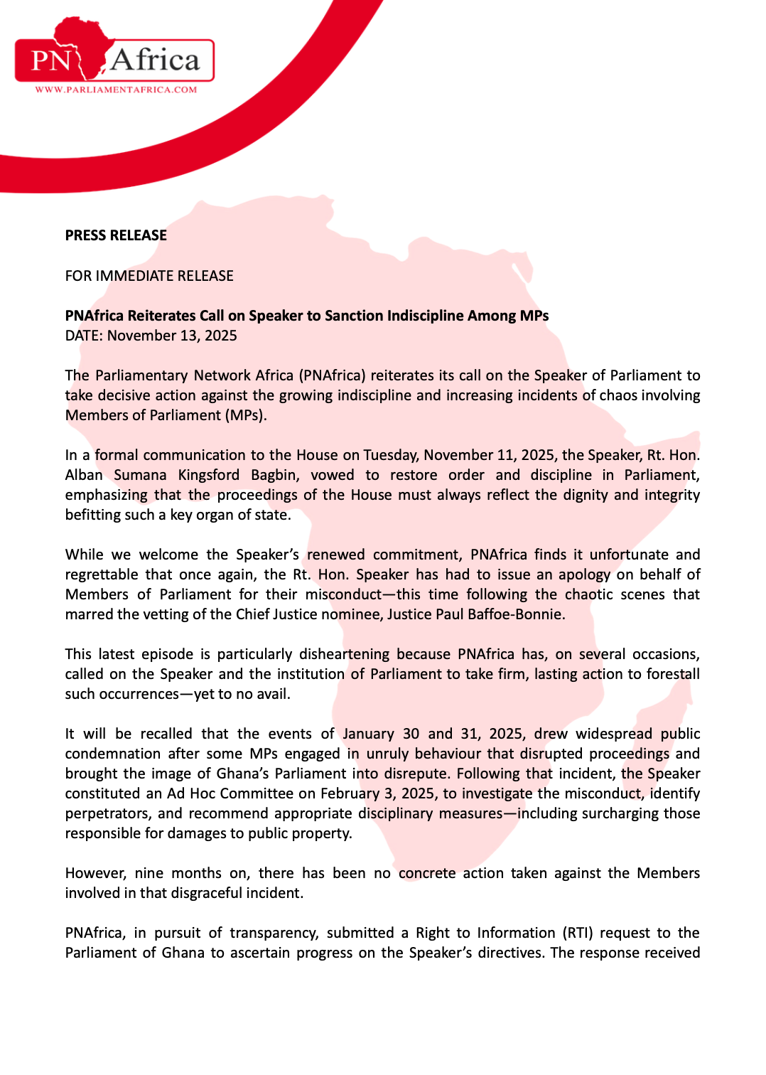 PRESS RELEASE – PNAfrica Reiterates Call on Speaker to Sanction Indiscipline Among MPs